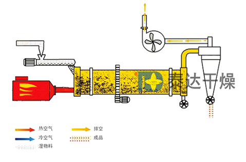 2、烘干機理科學合理、高效節能。物料在內筒與熱氣流以輻射、對流、傳導形式進行熱交換,在外筒熱交換以傳導、對流形式并用。