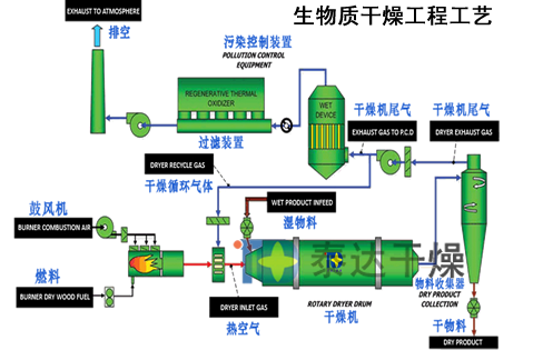生物質干燥裝置主要有熱源部分、干燥機主機、進、出料部分、除塵部分、引風系統組成。熱源部分為整個干燥過程提供熱量,干燥機主機為生物質燃料換熱干燥的場所,除塵部分去除尾氣中的粉塵顆粒,減少煙塵排放,引風機提供熱風在整個干燥主機流動的動力。