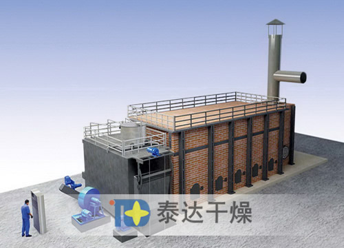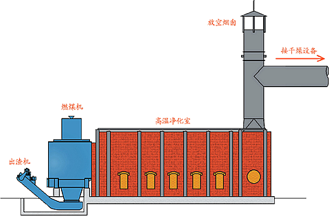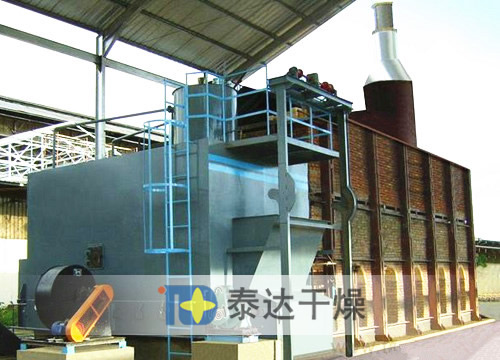 直燃式燃煤熱風爐由燃煤機、高溫氣體凈化沉降室和配風室組成。熱風爐輸出熱量為50~2000×104 kcal/h,輸出溫度為100~1200℃。原煤(煙煤)通過上煤機加入到燃煤機的煤斗中,再由鏈條爐排勻速送入燃燒室,在助燃鼓風機鼓入的空氣作用下劇烈燃燒,煤燃燒所產生的含塵高溫煙氣進入高溫氣體凈化沉降室內進行二次燃燒,煙氣中所夾帶的少量粉塵在凈化室內經高溫熔融、聚合、沉降。凈化室內出來的潔凈熱風摻入一定量的冷風,能夠提供不同溫度的潔凈熱煙氣,可為各類大型干燥系統(如流化床、閃蒸、噴霧塔、回轉圓筒、烘房、氣流干燥器等)提供熱源。連續供熱風溫度穩定性±5℃。煤渣由燃煤機另一端的除渣機排出。