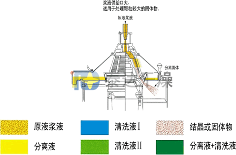 立式離心脫水機是利用機械旋轉產生的離心力,實現固液混合物分離,物料通過入料口,經布料錐進入篩籃與刮刀之間的空間,在離心力的作用下,離心液透過物料層,穿過篩網,沿上蓋流入機座上部的集水槽內,然后通過設在機座兩側的排液管排出機外,固體顆粒則保持在篩籃內側,因螺旋刮刀與篩籃之間有一轉速差,螺旋刮刀就將國體顆粒從篩網上刮下,并將其推送至篩籃底部,從而把脫水后的固體顆粒卸到機器下邊的收料漏斗里,這一過程連續不斷地進行。