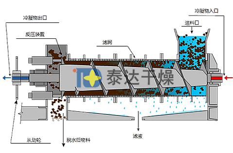 螺旋擠壓脫水機啟動后,需脫水的高濕物料從進料箱均勻加入,物料在螺旋旋轉葉片推動下沿軸向向出料端移動,在變化的螺距、螺桿和調(diào)節(jié)擋板的巨大的擠壓力作用下,物料完成機械脫水作業(yè)。水分通過篩網(wǎng)在出水口排出,脫水后的物料在出料箱處排出。對于物料品種的不同和產(chǎn)量的變化可通過調(diào)整脫水機實現(xiàn),達到脫水效果和產(chǎn)量的最佳配合。